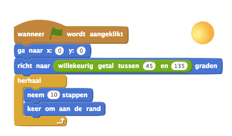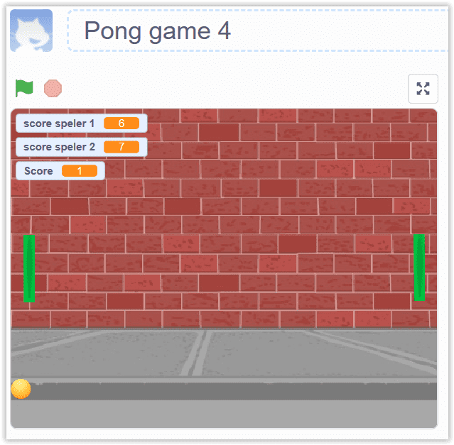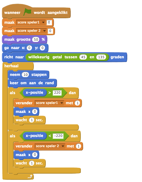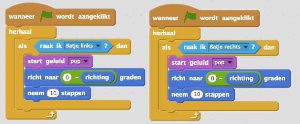 Hieronder staan twee scripts van de bal waarin de bal omkeert als een van de twee batjes wordt geraakt. De naam van de batjes kun je veranderen door op het blauwe balletje met i te klikken.