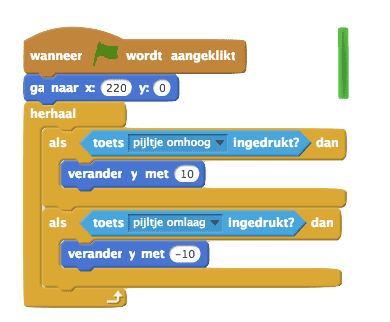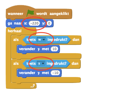 Het script van het batje zet eerst het batje aan de rand van het scherm. En “luistert” dan met twee als … dan … -blokjes of er op pijltje omhoog of pijltje omlaag wordt gedrukt. In Scratch gebruik je x voor links/rechts en y voor hoog/laag.