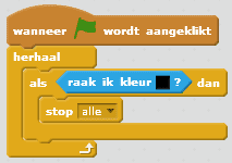 Sleep het blokje, zoals je hieronder ziet, en dat onder Waarnemen staat (licht blauwe kleur), naar het scriptveld en plaats het blokje in het blokje van Als dan. Tussen de woorden “als” en “dan”.