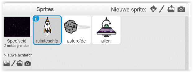 (Deze 3 sprites kun je zelf maken, of zoeken bij “nieuwe sprites uit de bibliotheek”, of vragen aan één van de begeleiders, die heeft deze sprites op een USB-stick.)