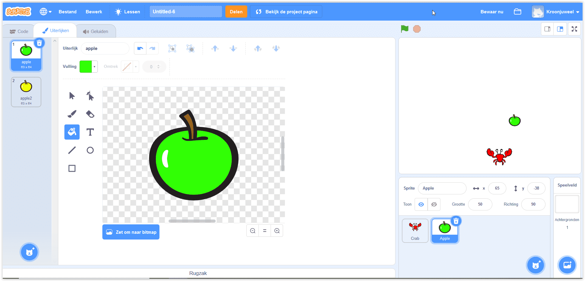 We passen het eerste uiterlijk van Apple aan en maken die groen. Nu heeft de sprite Apple dus 2 uiterlijken. Een groene kleur en een gele.