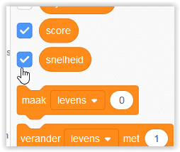 Klik bij Variabelen op het v-teken in het blauwe vakje voor de variabele “snelheid”. Je ziet dan die variabele in het speelveld onzichtbaar is geworden.