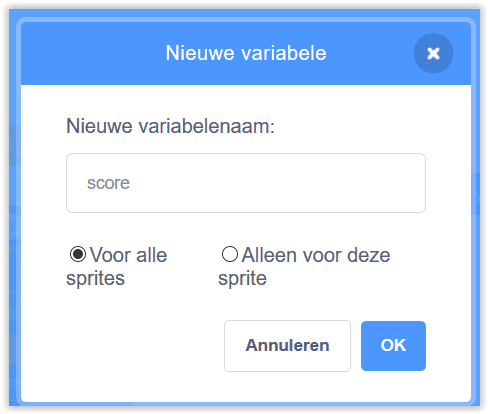 Je krijgt dan een invulvenster, en vul daarin “score” omdat jouw variabele score gaat heten. Klik daarna op de Ok knop.