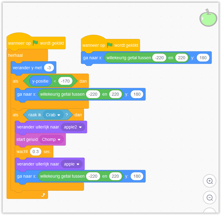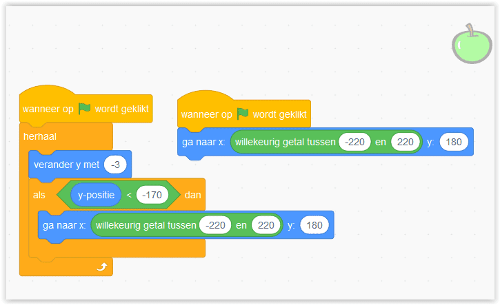 De appel moet wel altijd bovenaan beginnen en ook nog op een willekeurige plek als er op de groene vlag wordt geklikt. Dus we brengen in het scriptveld van Apple weer een blokje “Wanneer op de groene vlag wordt geklikt” aan en plak daaronder het blokje “Ga naar x 210 en y 261” Maar die x-coördinaat moet steeds anders zijn (Ergens bovenaan links of rechts). Plaats daarom het blokje “Willekeurig getal tussen 1 en 10” op de plaats van het getal dat achter x staat. Dan gaan we de getallen 1 en 10 aanpassen. Je begint links met -220 tot helemaal rechts 220. Verander dus de1 in -220 en de 10 in 220. Dus ergens tussen die 2 getallen, -220 (helemaal links) en 220 (helemaal rechts) moet de appel bovenaan verschijnen.