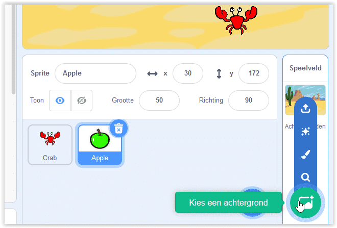 Ga daarvoor naar het vak waar de sprite crab staat, en klik dan weer op de sprite met het + teken, rechts onderaan in dat vak. Er verschijnt een bibliotheek met allemaal sprite figuren. Zoek naar “apple” en laat deze in het programma door er met de linker muisknop op te klikken. We maken deze apple meteen een stuk kleiner (anders wordt die wel heel makkelijk gevangen). We maken de apple ook de helft kleiner. Van 110 naar 50.