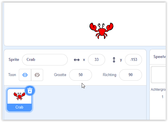 Als je nu op de groene vlag klikt staat de crab meteen op de juiste plek en kun je met de pijltjes toetsen de crab naar links en rechts bewegen.