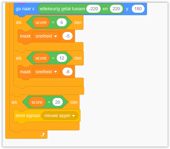 Nu moet je nog zeggen wat er dan moet gebeuren. De appel moet weer naar een willekeurige plaats bovenaan, zoals aan het begin van het spel. Kopieer daarom het script dat je daarvoor al gemaakt hebt ( ga naar x willekeurig getal tussen -220 2n 220 y 180) naar dit “als…dan” blokje en plaats het in de lege regel onder “als…dan”. Verander nog wel eerst even de y-positie 50 in y-positie -170 in dat “als…dan” blok.