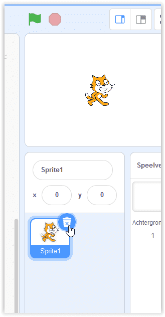 We gaan eerst de sprite “cat” verwijderen, want die hebben we niet nodig.