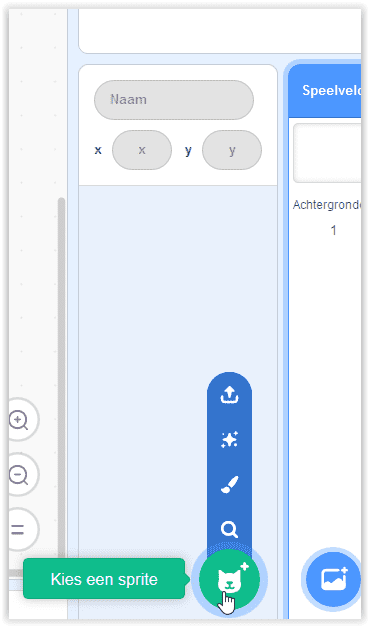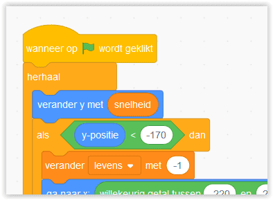 Breng nu het blokje: “Verander y met 10” van “beweging” in het blokje “Herhaal” en verander het getal 10 in -3. (-3 geeft de snelheid van vallen aan. -4 is sneller, -5 is nog sneller enz.).
