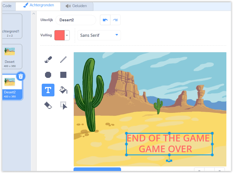 Zorg er dan voor dat de vulling de kleur rood heeft (of een andere kleur als je dat mooier vindt) en klik dan op de T om een tekst te kunnen maken. Maak dan de tekst “END OF THE GAME GAME OVER” . Dus Desert2 gebruiken we om als achtergrond te dienen als het spel is afgelopen.