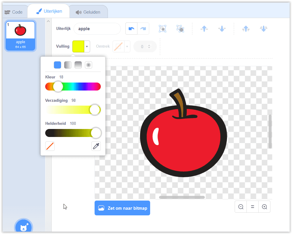 We gaan de apple een andere kleur geven. We gaan hem geel maken.