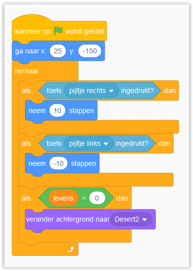 Neem een “Stop Alle” blokje uit “Besturen” en plaats dat onderaan in het blokje waar staat: “Als leven = 0 “ .