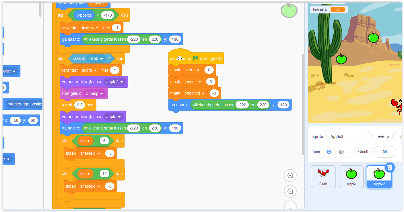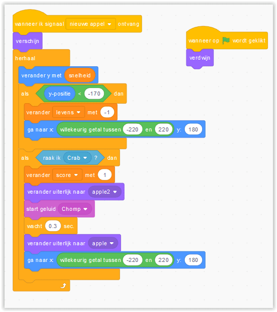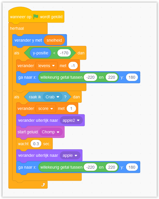 Nu gaan we nog iets toevoegen. Als de appel de Crab raakt, moet de appel van kleur veranderen. Sleep daarom het blokje: “verander uiterlijk naar apple2 “ uit “uiterlijken” naar de plek onder de regel “Als raak ik de crab dan”. \