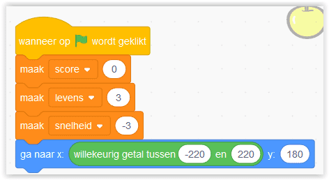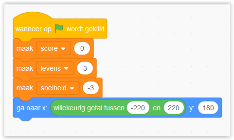 Sleep het blokje “maak snelheid 0” naar het scriptblok van het opstarten en maak dan van de 0, -3. De snelheid waarmee begonnen wordt is dus: -3.