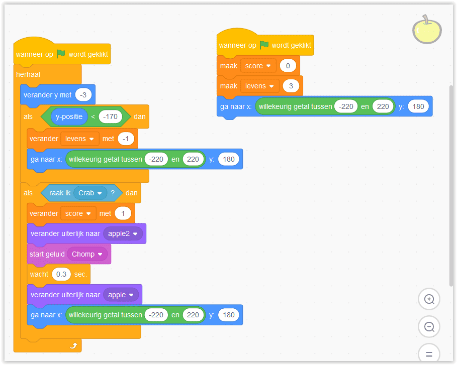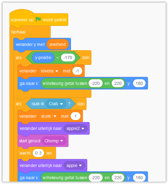 Dan moet je het blokje “verander levens met 1” uit “variabelen” slepen naar de herhaal lus en het plaatsen in het blok “als y positie < -170 dan” meteen bovenaan in dit blok. De appel is namelijk op de grond gekomen. We moeten nog wel even bij “verander levens met 1” de 1 veranderen in -1 want we verliezen een leven en krijgen er geen bij.