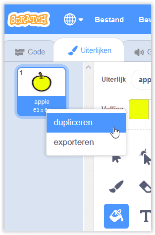 We willen straks misschien het uiterlijk van de sprite apple kunnen laten veranderen. Daarom maken we een tweede uiterlijk door in het tabblad Uiterlijk op de sprite van de apple te klikken en dan op “dupliceren” te klikken.