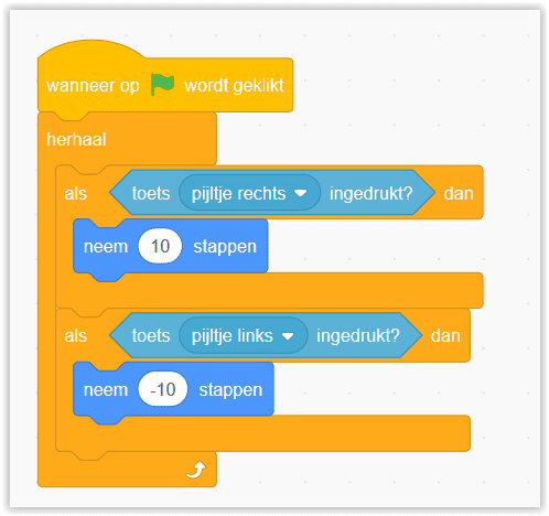 Neem nu het blokje: “neem 10 stappen” uit “bewegen” en plaats dat in het “als..dan” blokje.