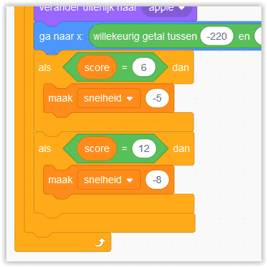 Het laatste blok kopieer je nu en maak voor score 12 en voor snelheid dan -8. Dit blok plaats je onder het eerste blok dat je net gemaakt hebt