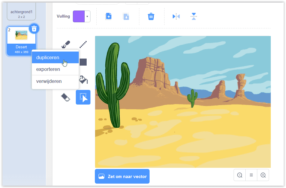 Sleep het blokje: “Als er op de groene vlag wordt geklikt” uit gebeurtenissen, naar het scriptveld. Sleep het blokje “verander achtergrond naar Desert2” uit “uiterlijken” naar dit script veld en plak dit blokje aan het blokje “Als er op de groene vlag wordt geklikt”. Klik op het driehoekje achter het woord “Desert2” en kies dan voor “Desert”. (Als “Desert” daar al staat kun je dat natuurlijk gewoon laten staan.