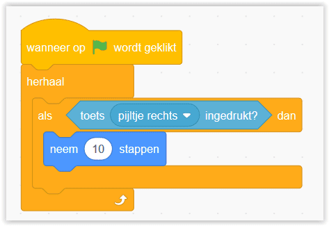 We nemen daarvoor het blokje “Als…. dan” uit besturen en plaatsen dat in het herhaal blokje. We nemen daarna het blokje “Toets spatiebalk ingedrukt” uit “waarnemingen” en plaatsen dat in het vakje tussen de woorden “als” en “dan”. Klik dan op het driehoekje naast het woord “spatiebalk” en kies dan voor: “pijltje rechts”. Er staat nu dus eigenlijk: “als pijltje rechts ingedrukt dan”.